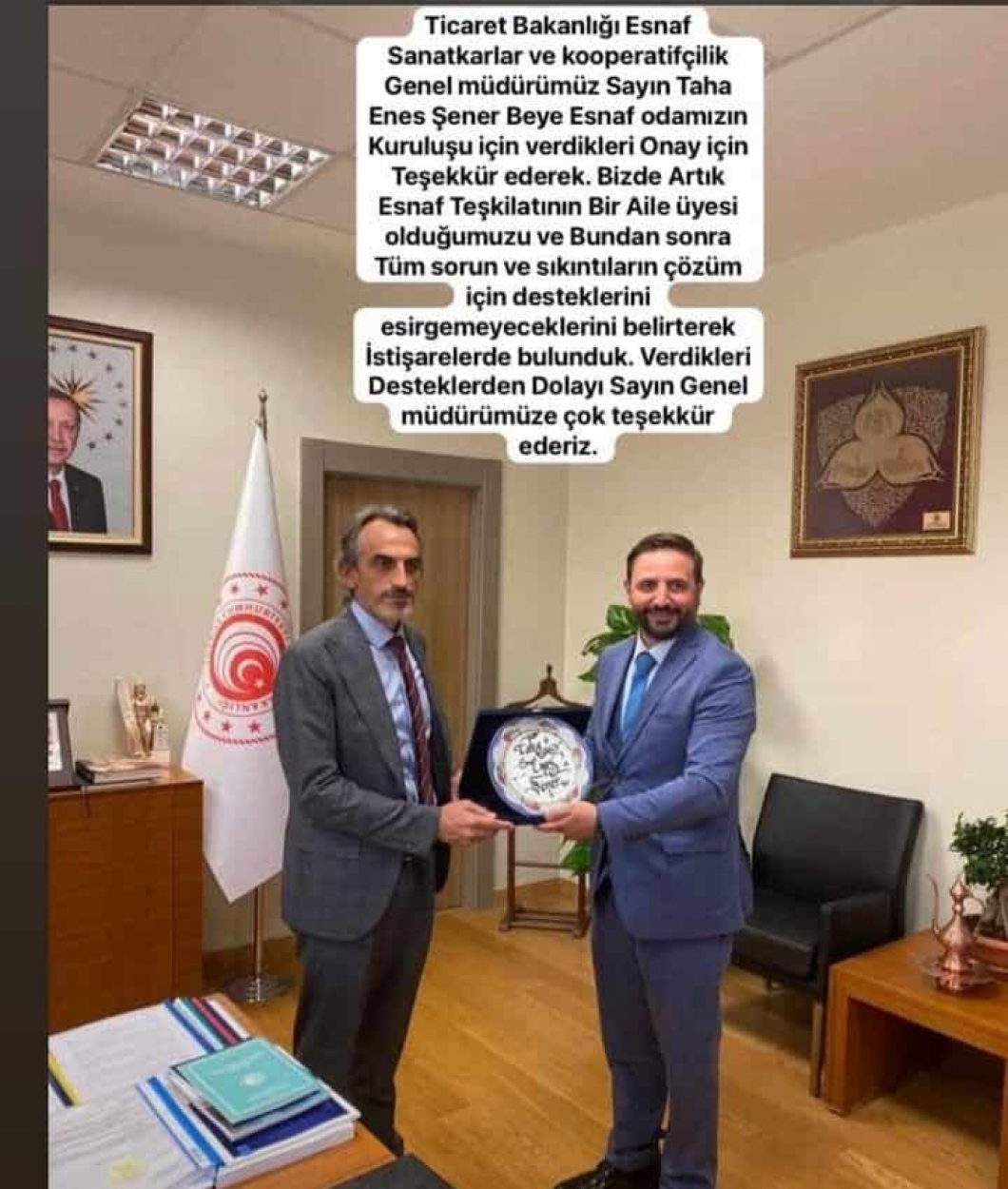 Bu teşekkür ziyaretinde, Ticaret Bakanlığı Genel Müdürü sayın Taha Enes Şener'e, Başkan Ramazan Akpınar tarafından birde teşekkür plaketi verildi..Ayrıca; Odanın kurulmasında ilgi ve desteklerini esirgemeyen Bakanlık personelini de, yönetim kurulu olarak şubelerini tek tek ziyaret ederek bizzat teşekkür edildi.